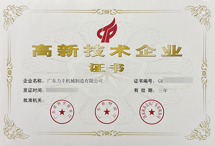 廣東力豐機械制造有限公司于2016年成為國家高新技術企業